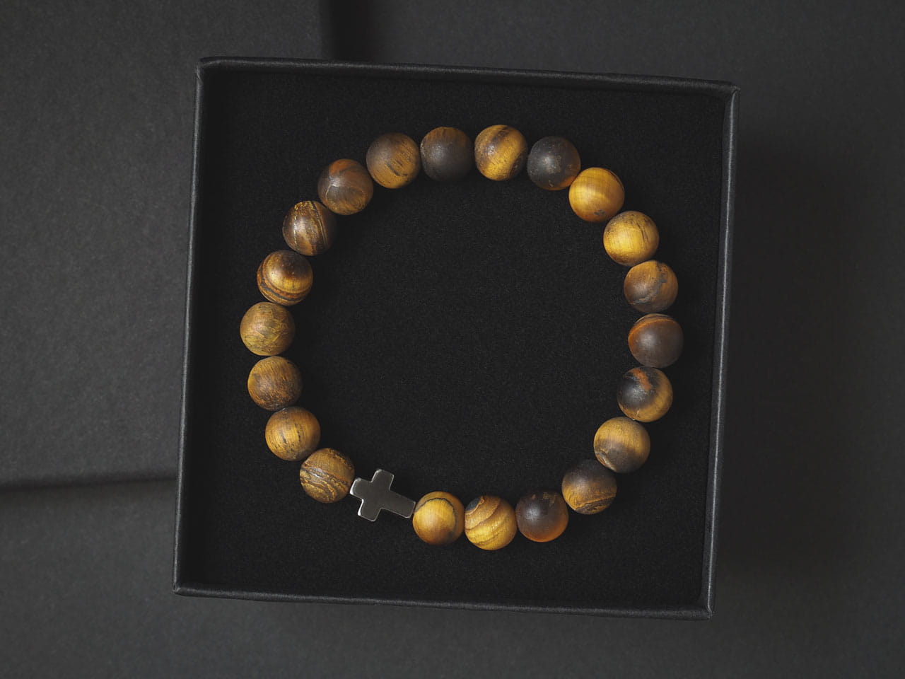 Bransoletka z krzyżem dla Niego z matowymi koralikami tygrysiego oka