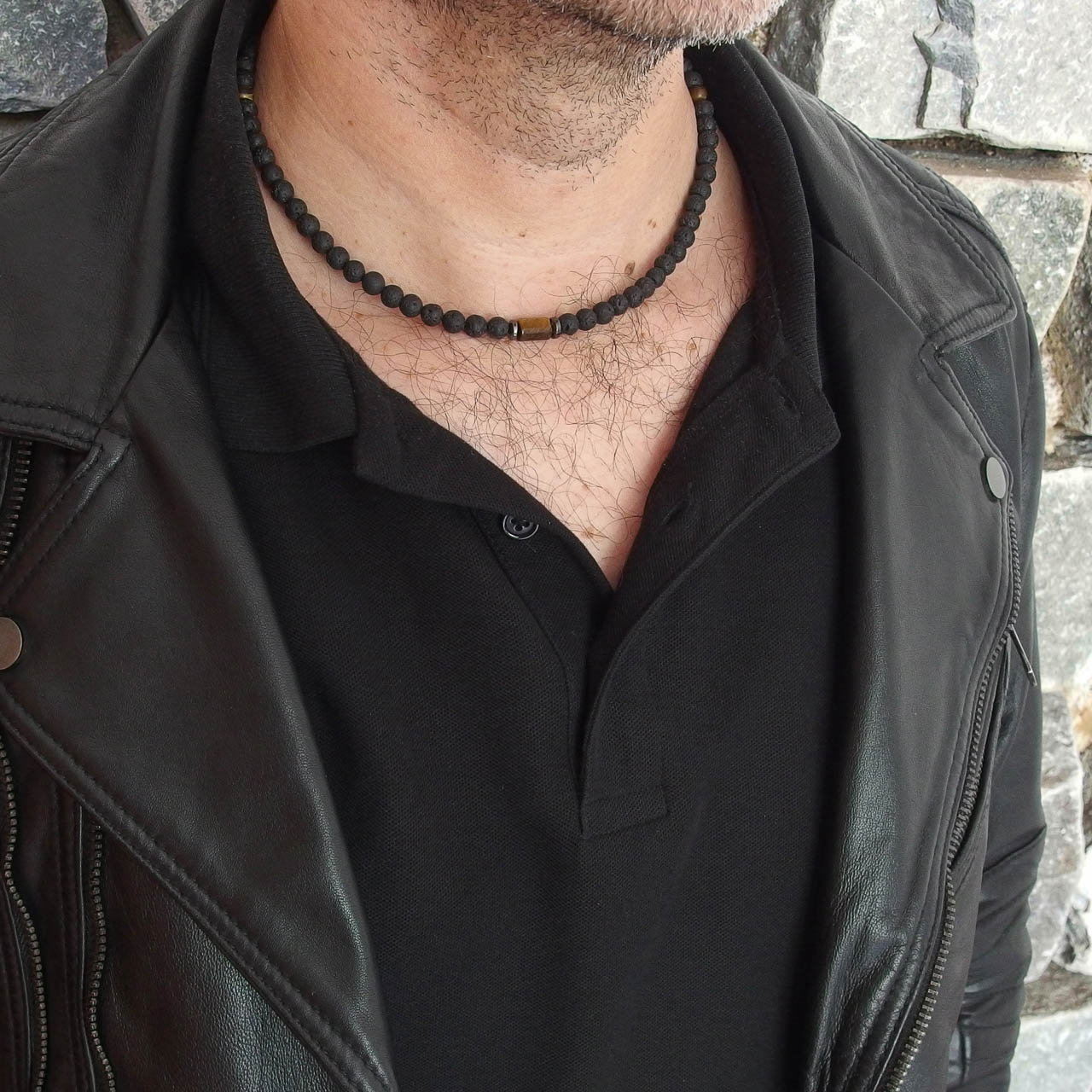 Naturalne tygrysie oko i czarna lawa wulkaniczna w naszyjniku dla Niego